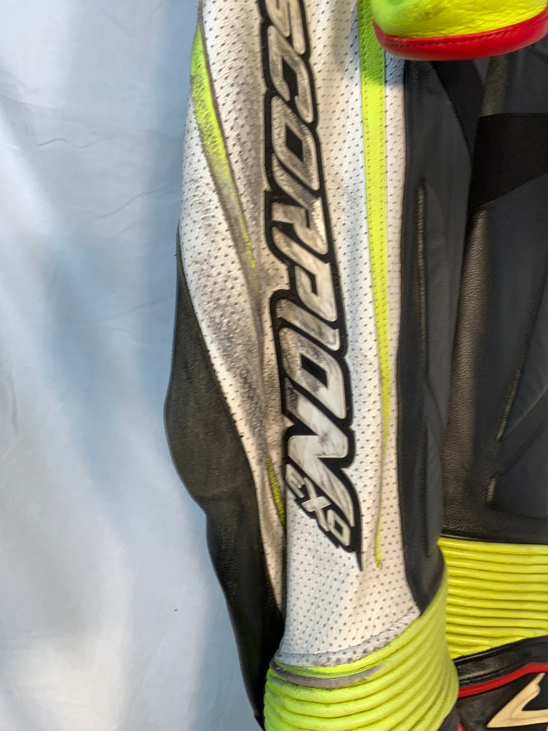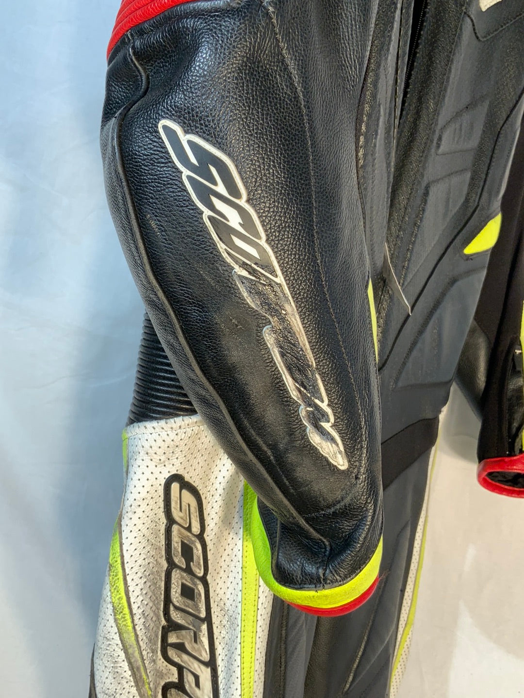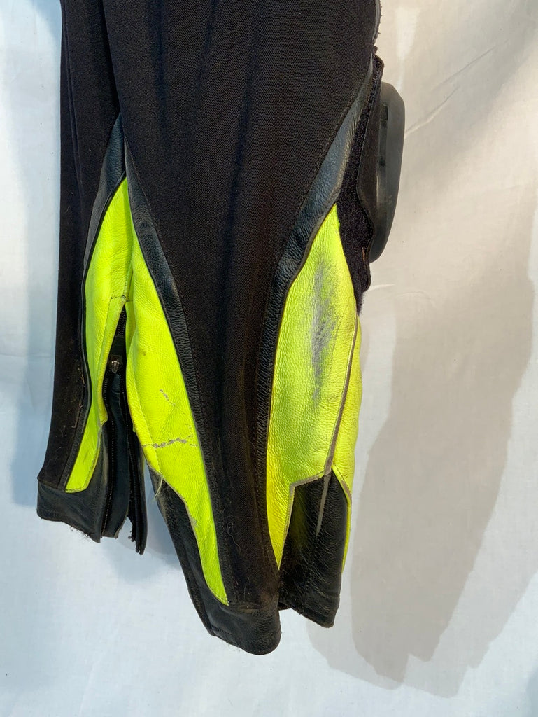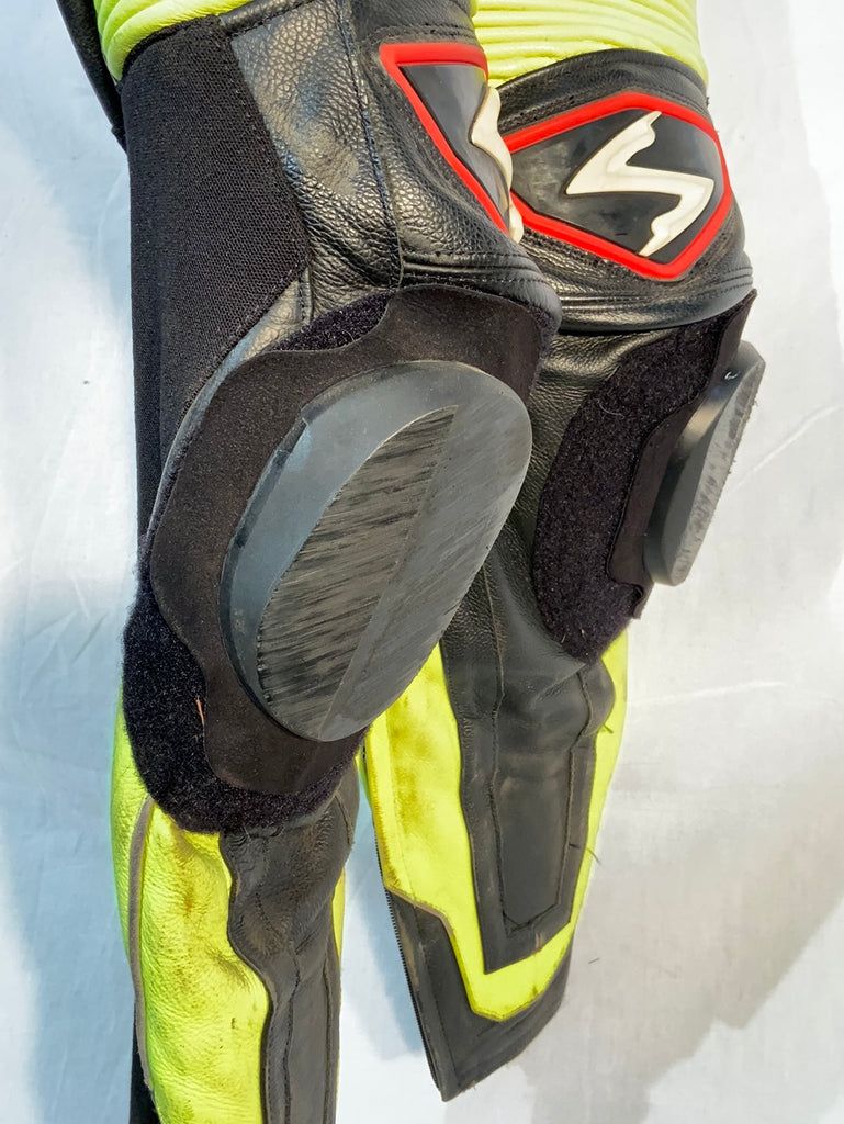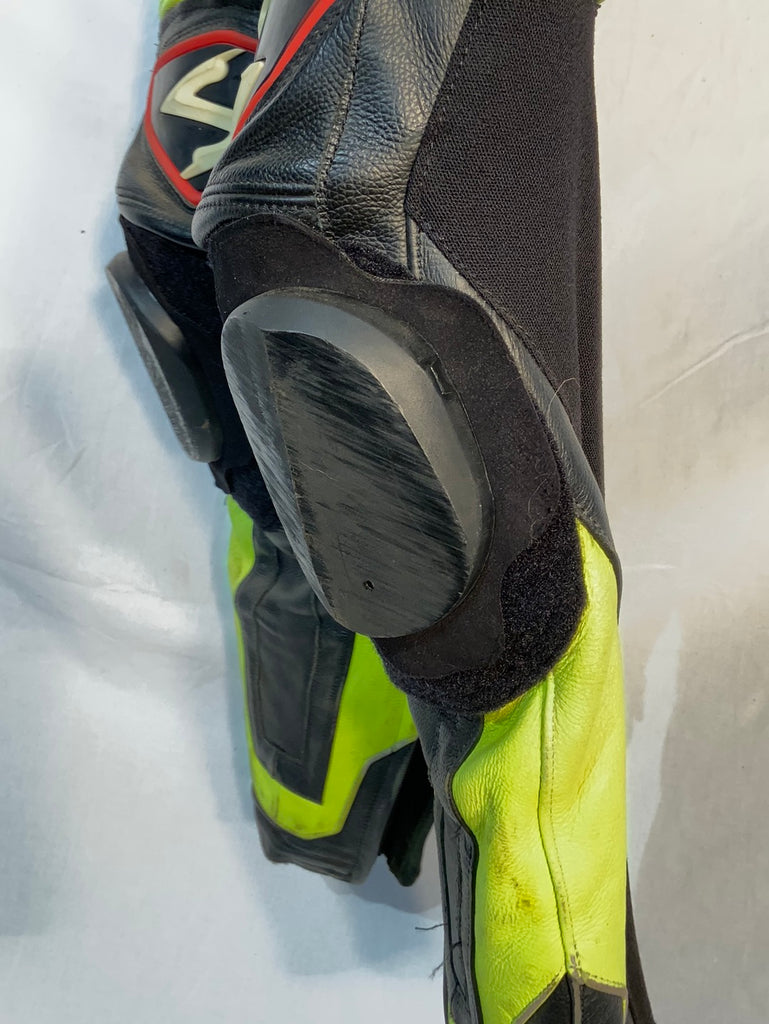 Good condition, but minor crash rashing on right side. Logo on left arm is scuffed/melted, rashing on right thigh, knee and shin. Knee pucks are ~50% worn. Size Medium