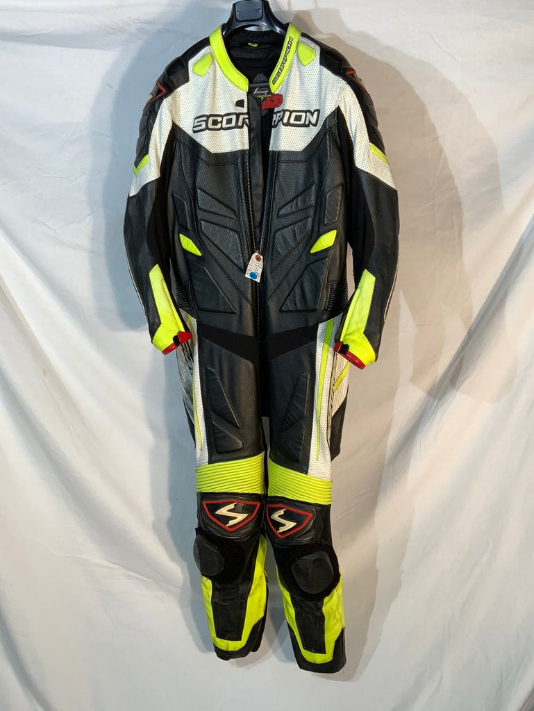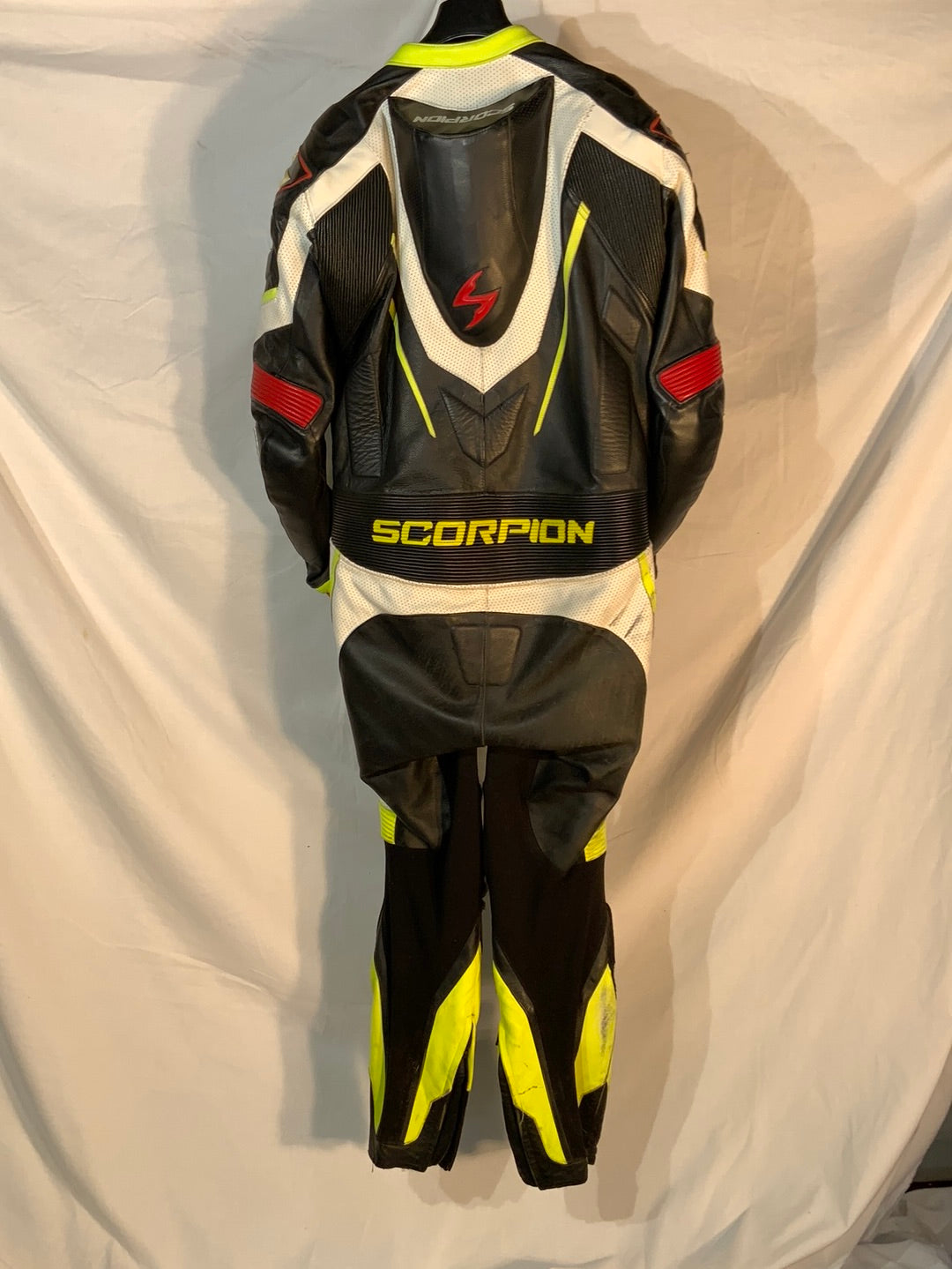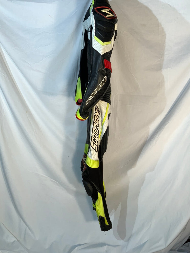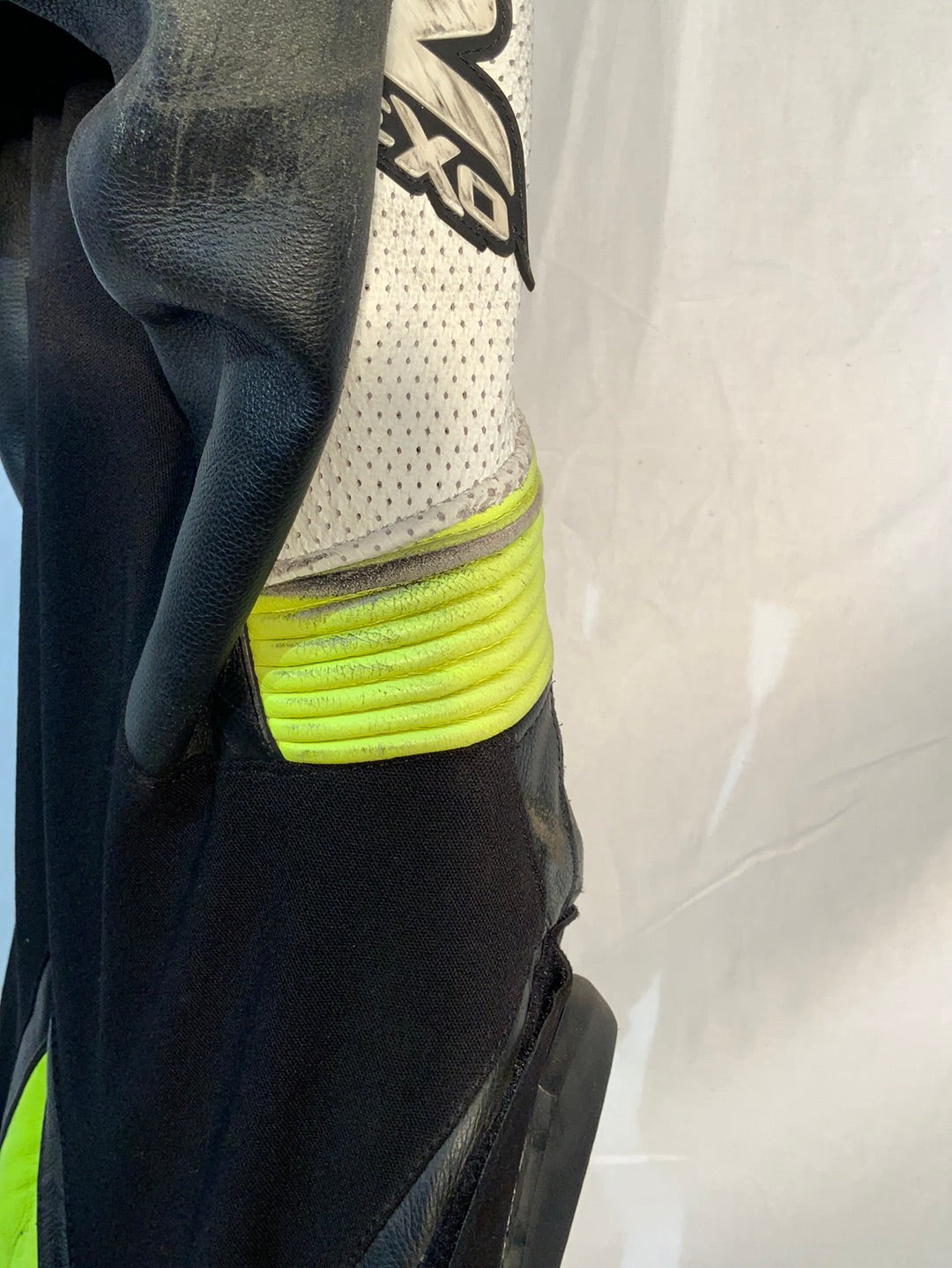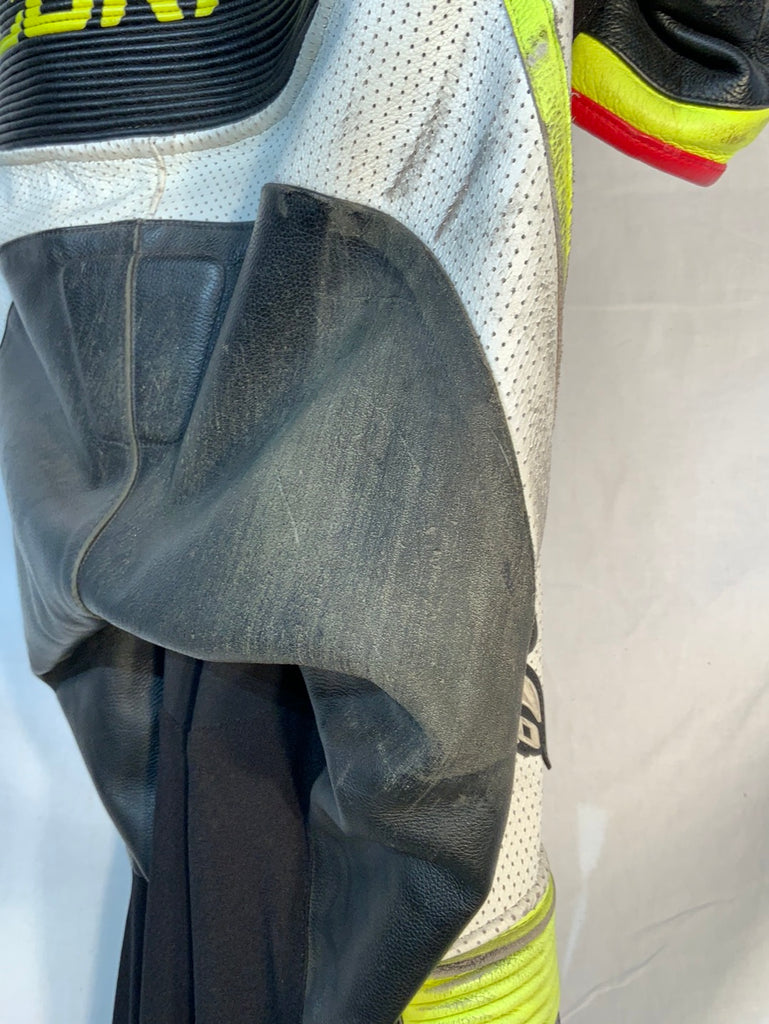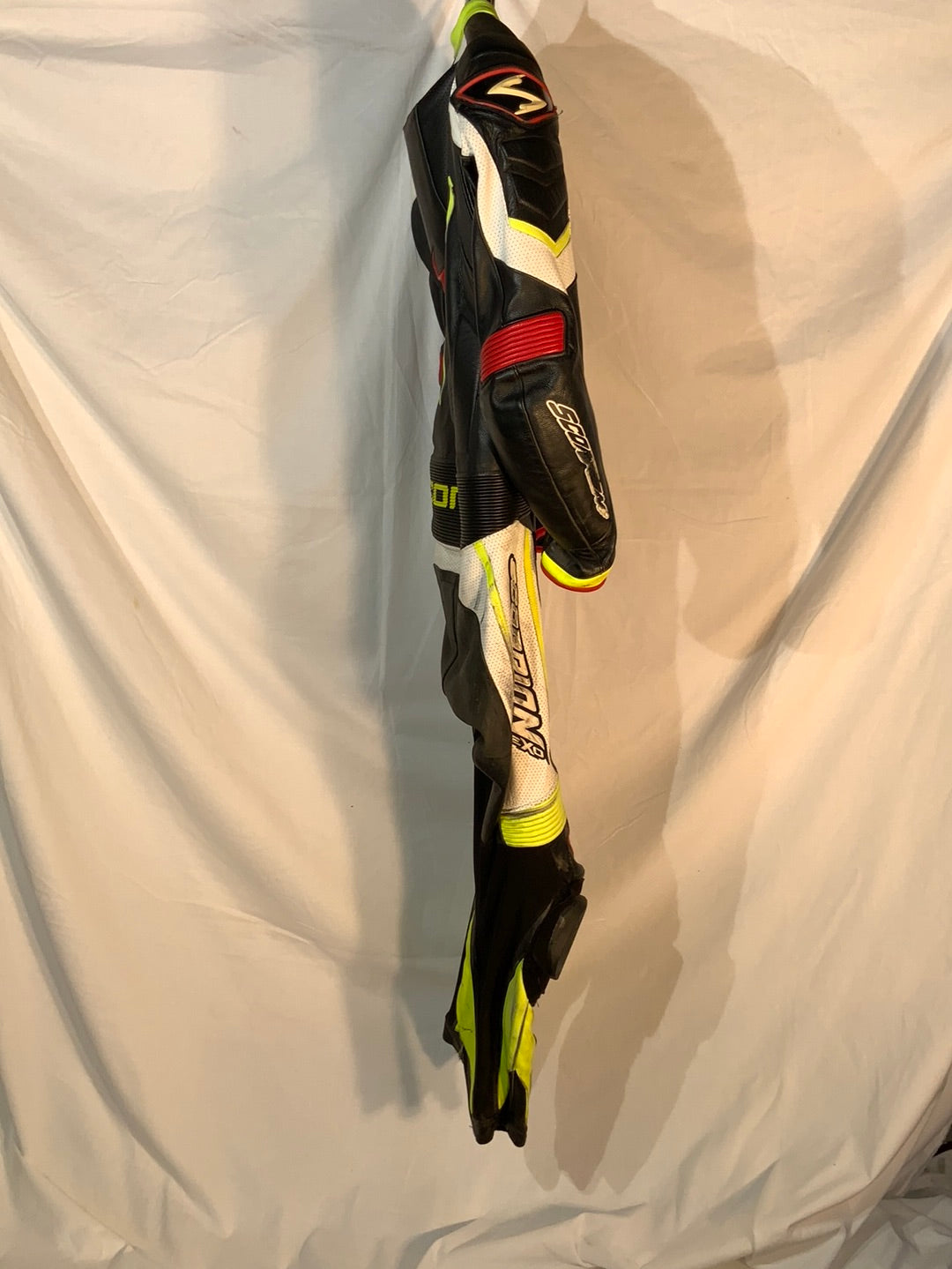 Good condition, but minor crash rashing on right side. Logo on left arm is scuffed/melted, rashing on right thigh, knee and shin. Knee pucks are ~50% worn. Size Medium