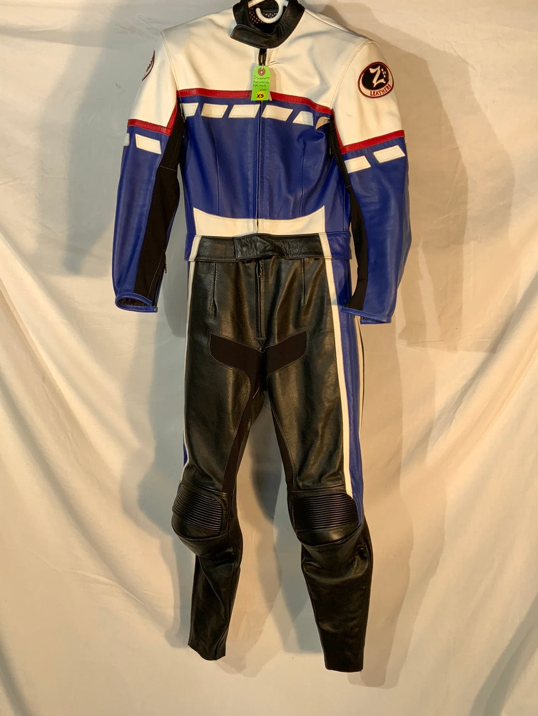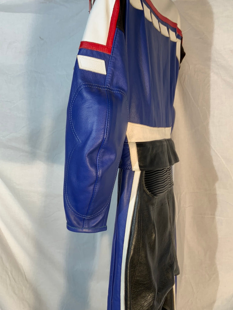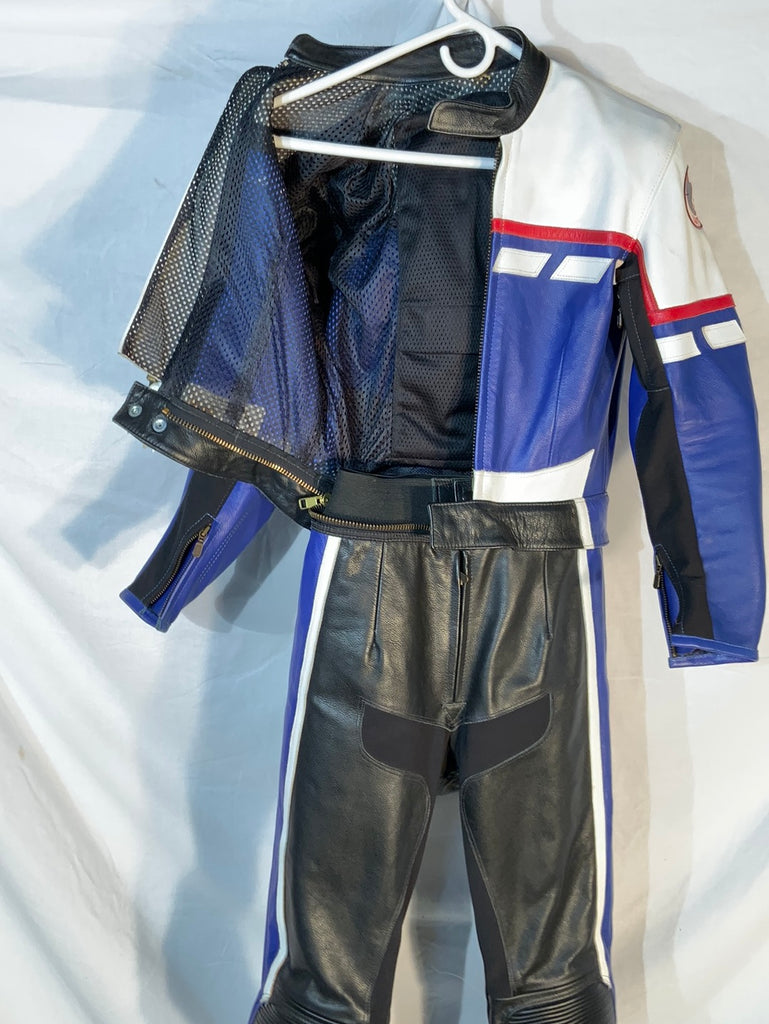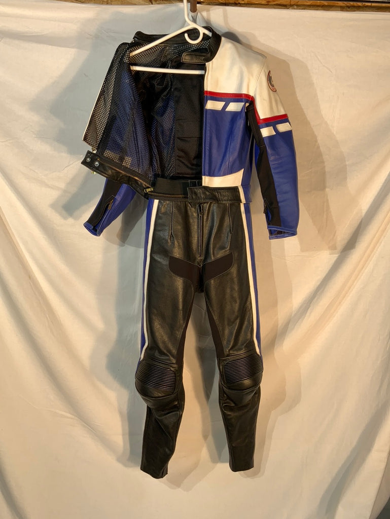 2-piece leather riding suit. Jacket and pants have a 360-degree zipper attaching them together, making this suit legal for track useage. Note: Suit does not have Velcro for knee pucks. Size Xtra-Small