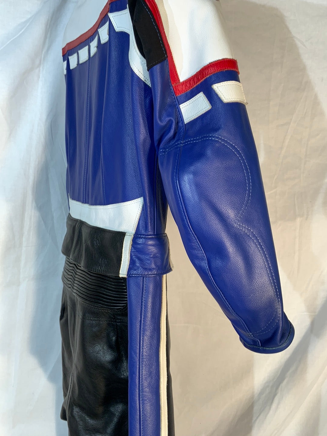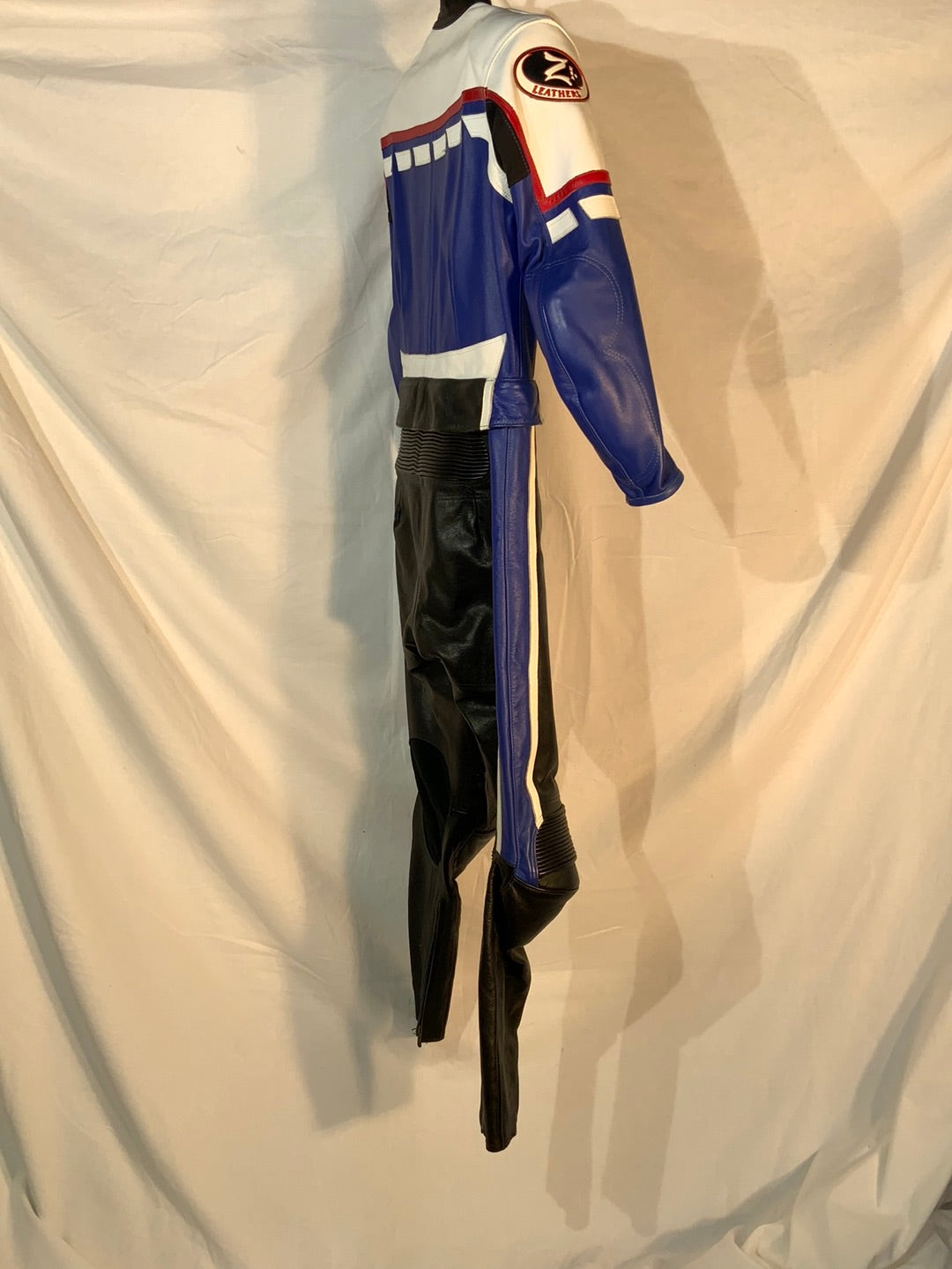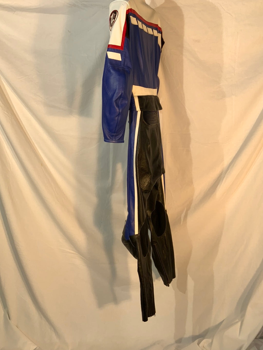2-piece leather riding suit. Jacket and pants have a 360-degree zipper attaching them together, making this suit legal for track useage. Note: Suit does not have Velcro for knee pucks. Size Xtra-Small